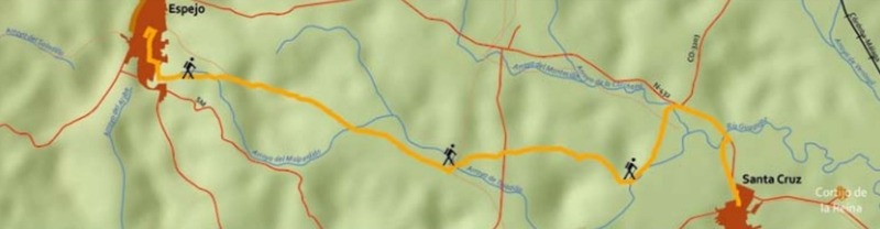 Tomamos ésta por nuestra izquierda, para alcanzar la localidad de Espejo en aproximadamente 4 kms. Aquí tenemos dos opciones: bien entrar en esta bella localidad de blancas casas recostadas sobre una loma coronada por el hermoso castillo medieval o bien bordear el pueblo dejándolo a la izquierda buscando el silo, para tomar un camino en bajada hacia el arroyo de la Pontanilla, donde encontramos un pequeño puente romano y restos de calzada.